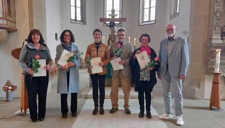 Helga Hänschke, Edeltraut Genc, Roberta und Jürgen Weisert sind seit 25 Jahren zuverlässig und mit Begeisterung beim Gesang dabei.Ursula Essig hat schon vor 60 Jahren in ihrer Heimat Unteröwisheim mit dem Chorgesang begonnen und dies hier in Kürnbach weitergeführt.Alle 5 geehrten waren und sind außerdem in verschiedenen Funktionen und Ämtern für das Zusammenleben im Chor wichtige, aktive Stützen.Bezirks-Kirchenchorobmann Lothar Gabriel bedankte sich bei den Geehrten für ihr Engagement und überreichte die Urkunden vom Kirchenmusikverband der Evang. Landeskirche Baden. Als Vertreterin des Chores hielt Käthe Kerber die Laudatio.Der Chor umrahmte den Gottesdienst mit zwei fröhlichen Liedern zum Lob Gottes,im Anschluss daran genossen wir die Bewirtung beim Empfang durch den Kirchengemeinderat im Gemeindehaus.