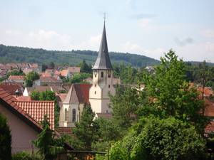 Dieser Bau wurde 1501 im spätgotischen Stil vollendet. Das Bistum Speyer finanzierte das Kirchenschiff, der Deutschorden den Chor und die Gemeinde den Ausbau des Turmes. Beim Bau wurde die Südmauer des bisherigen Kirchenschiffes als Nordmauer der heutigen Kirche verwendet, das Langhaus durch den Chorraum erweitert, zwischen Schiff und Chorraum ein Triumphbogen eingebaut und der Chor durch einen Zwischenbau mit dem romanischen Turm verbunden. Der Friedhof um die Kirche wurde als Terrasse umgestaltet. Doch bereits 1608 war die Kirche samt Turm “baufällig von unten an bis oben auß” und musste saniert werden.